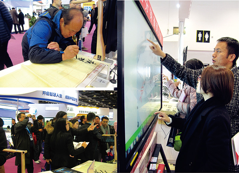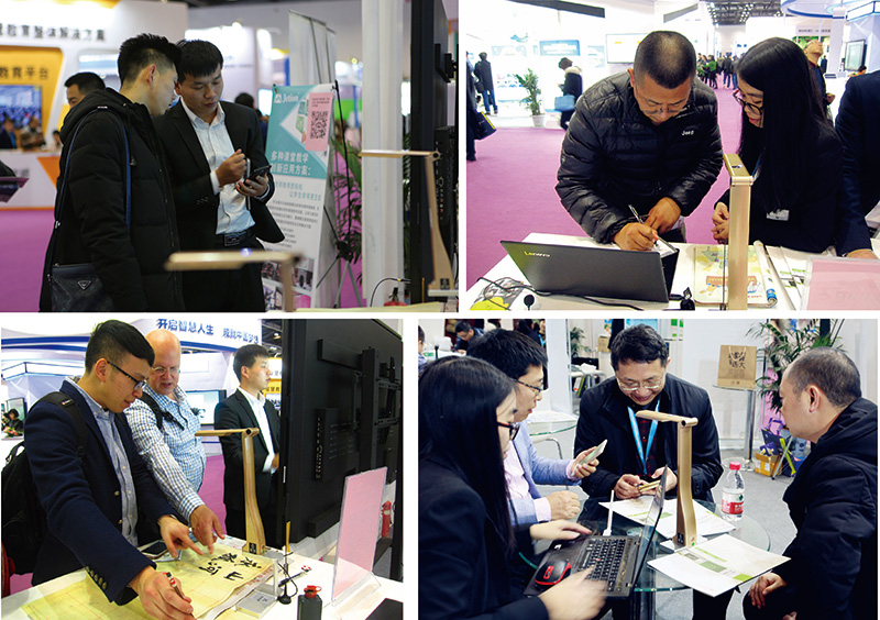 有的被吉星無線視頻展臺的微課應(yīng)用演示所吸引,或自己試用演示;有的忍不住在書法演示臺前留下墨寶,或駐足于吉星無線微錄儀各學(xué)科應(yīng)用宣傳屏幕前,詢問或洽談;有的拿著宣傳資料詳細(xì)閱讀,或掃碼,或一邊與吉星銷售經(jīng)理們互動……就這樣,第二天不到,吉星近千份宣傳冊已被一搶而空,而銷售經(jīng)理們都無一例外地嘶啞了嗓子。