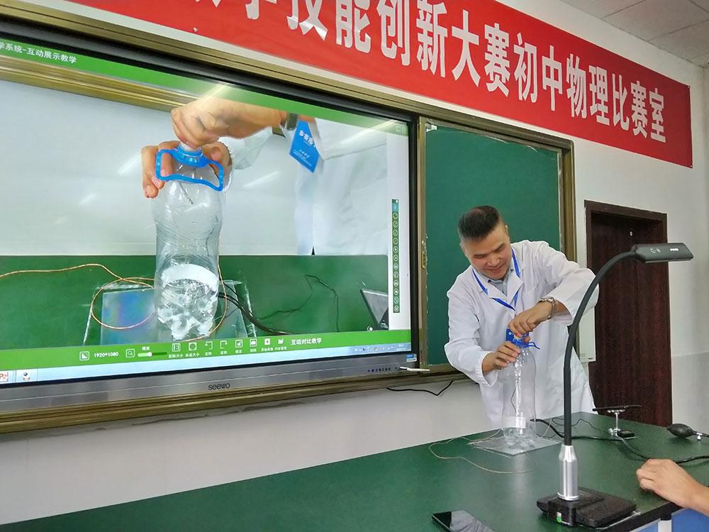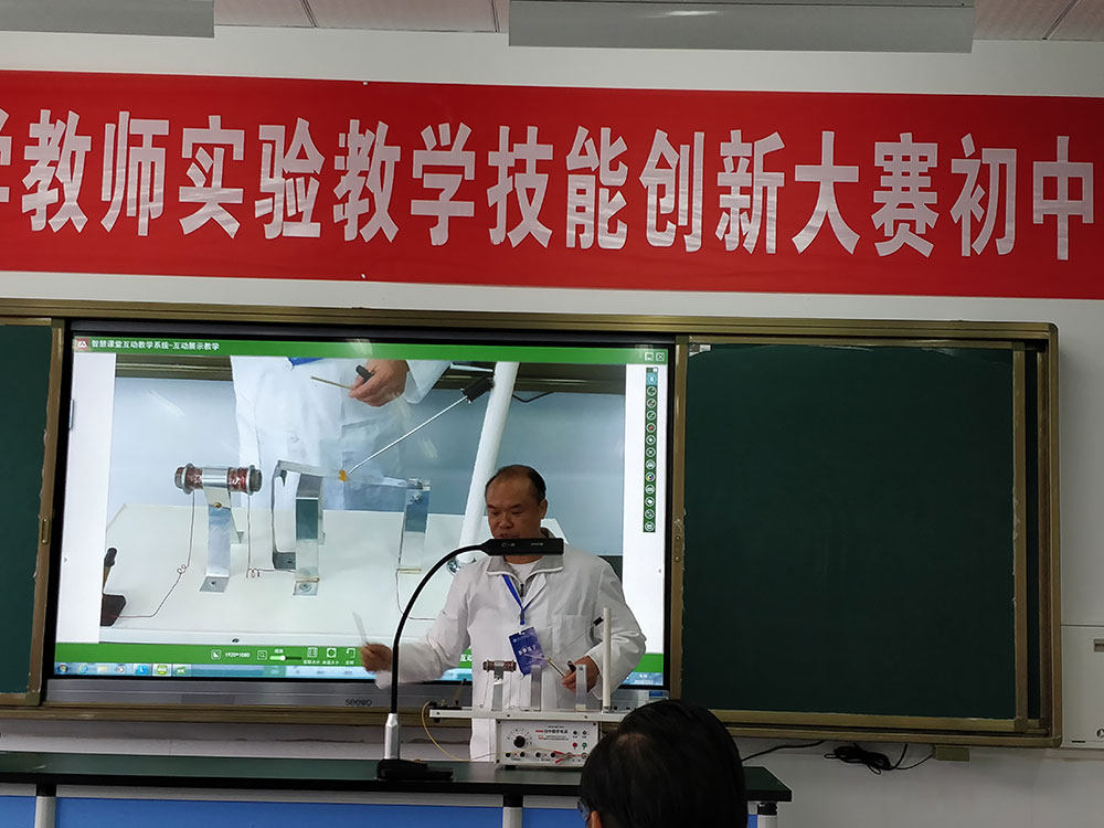 其中初中物理組的老師在比賽現(xiàn)場運(yùn)用吉星智慧實(shí)驗(yàn)室互動教學(xué)系統(tǒng)進(jìn)行實(shí)驗(yàn)操作。