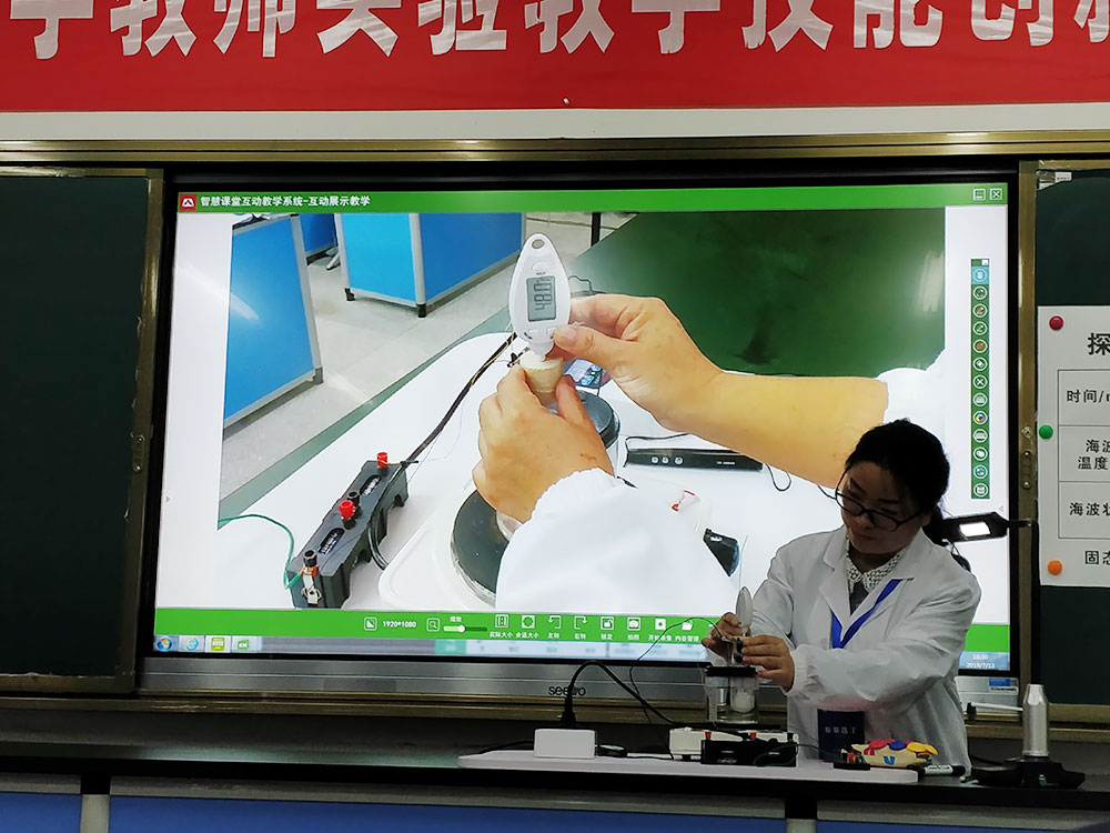 老師將實(shí)驗(yàn)操作過程清晰地在大屏幕上展示,現(xiàn)場評委、觀摩老師直觀地觀察實(shí)驗(yàn)操作的全過程;對于實(shí)驗(yàn)要點(diǎn),老師即時(shí)操作即時(shí)講解,充分展示了教師們的教學(xué)特色和風(fēng)采。