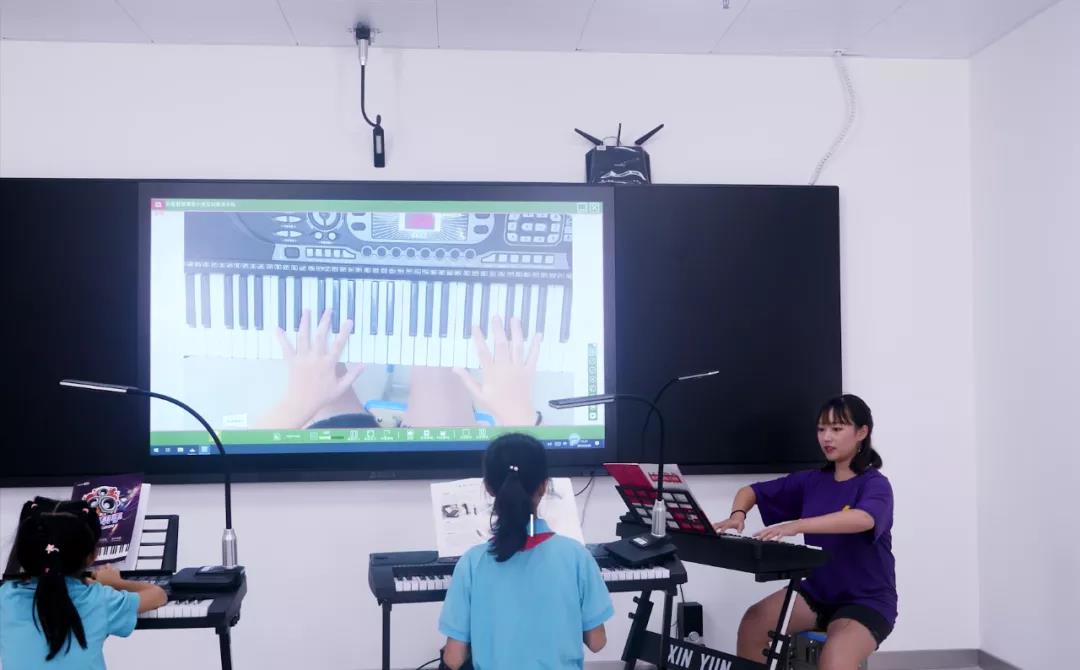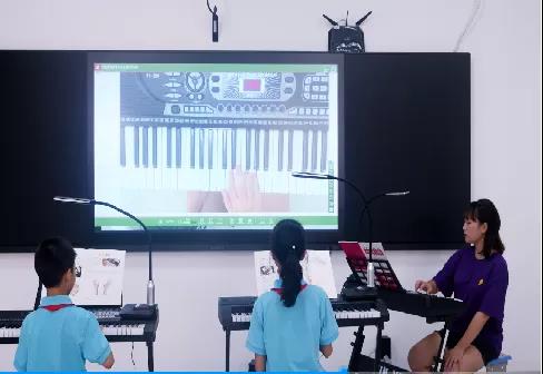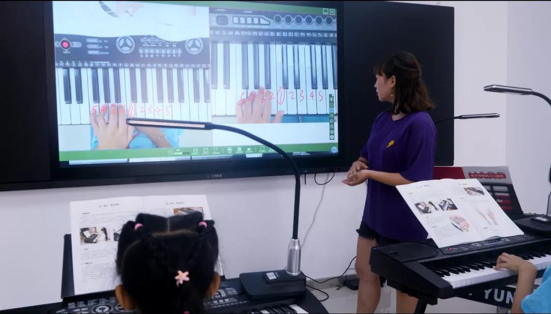 老師通過互動終端,將自己的彈奏示范操作大屏幕展示,每個學(xué)生可以即時地看到老師的彈奏過程、手臂動作等細(xì)節(jié),直觀地掌握課程要點。