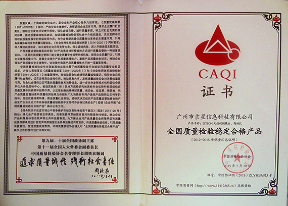 經(jīng)中國(guó)質(zhì)量檢驗(yàn)協(xié)會(huì)評(píng)定,吉星信息科技有限公司無(wú)線(xiàn)視頻展臺(tái)、高拍儀系列產(chǎn)品憑借其質(zhì)量過(guò)硬、信譽(yù)良好獲“全國(guó)質(zhì)量檢驗(yàn)穩(wěn)定合格產(chǎn)品”稱(chēng)號(hào)。