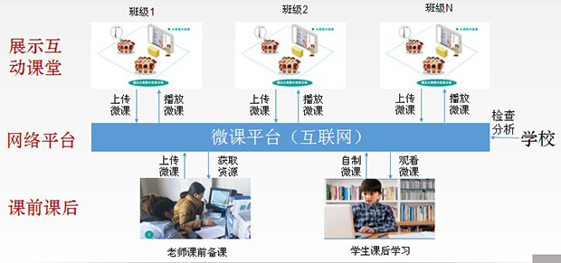 基于視頻展示互動課堂的微課學習平臺,是一個以微課為媒介、線上線下相結合的校園微課互動學習平臺。基于該平臺,老師可上傳錄制好的微課(關鍵知識點講解、典型學生作業(yè)講解、學生典型問題講解等),供學生觀看學習;學生可在課后通過微課平臺預習和復習相關知識點,也可自制微課,供其它同學和老師觀看;學校可通過該平臺,及時了解各班級教學質量及學習情況。