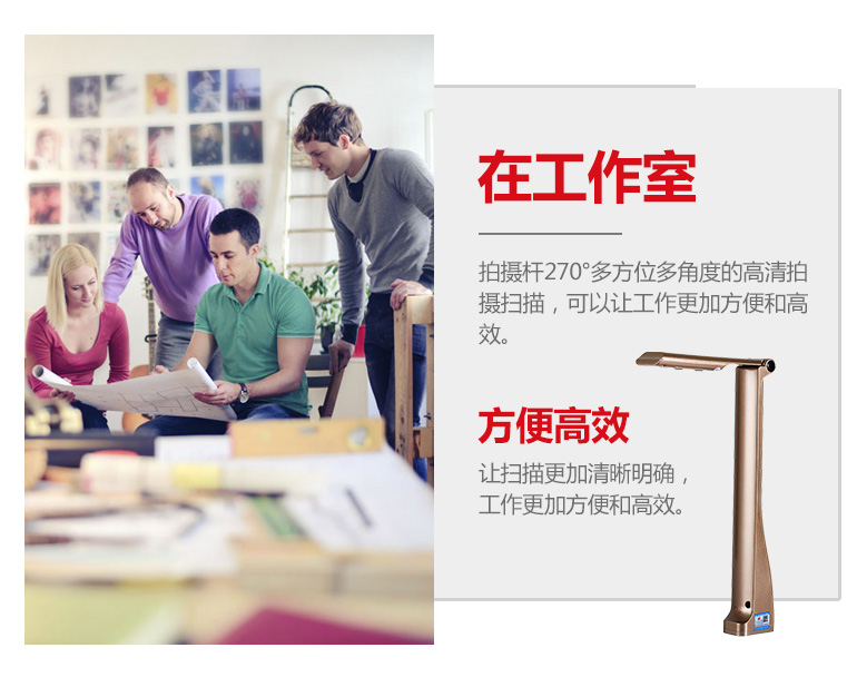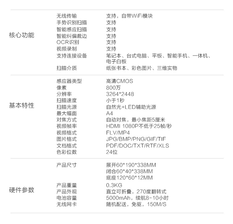 無線傳輸、手勢識別掃描、智能感應掃描、智能糾偏裁邊、OCR識別、視頻錄制等